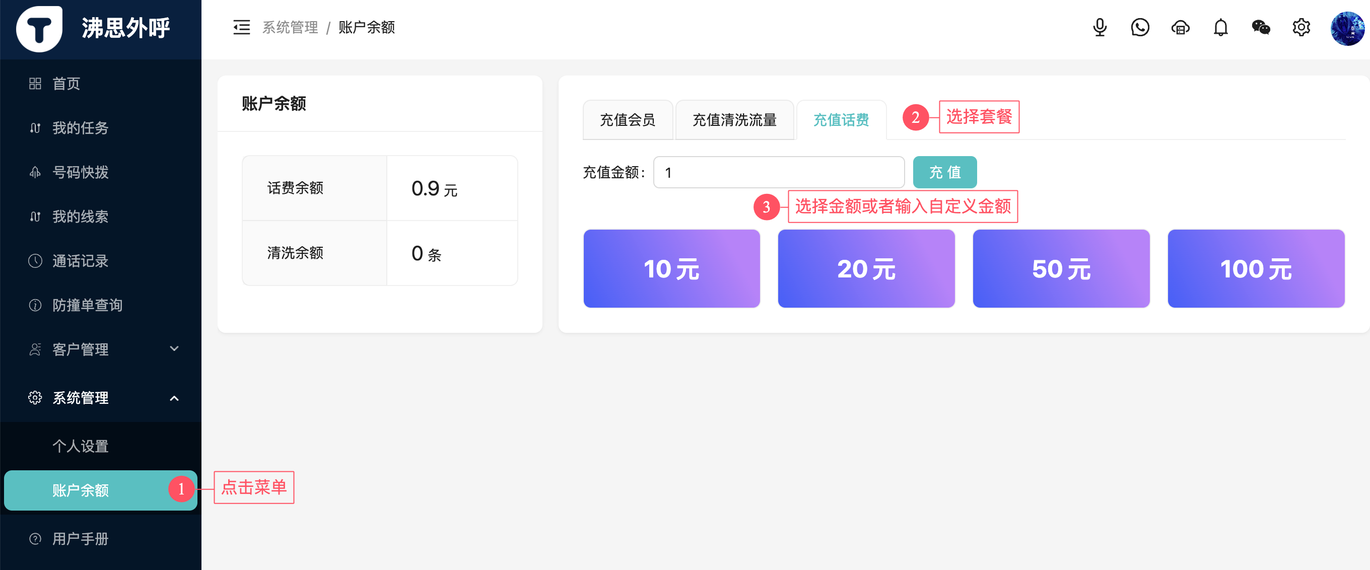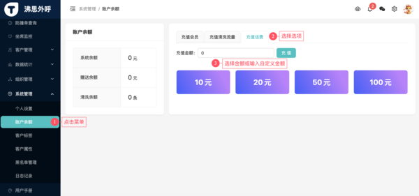 登陆网页端后台(https://cc-beta.fin-think.com/),点击右侧菜单中的“系统设置”-“账户余额”,选择“充值话费”,选择对应套餐或输入自定义金额点击充值,根据对应提示操作即可。