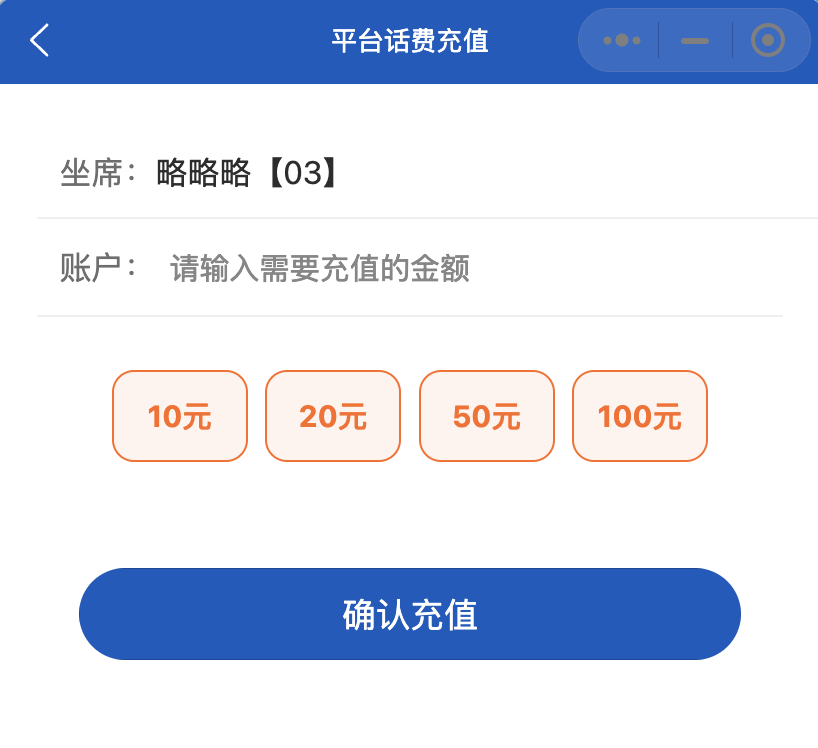 在微信小程序中登陆需要充值的账号,点击“个人中心”,点击平台话费剩余右侧的“充值”按钮,选择对应的话费金额或者输入自定义金额充值即可。