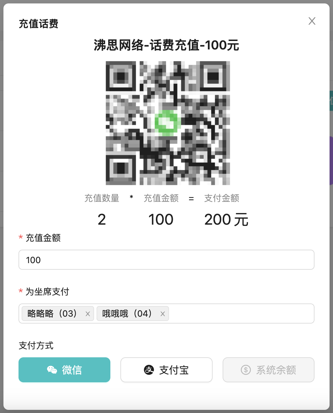 请注意,金额是给单个坐席充值的金额,最后需要支付总计的金额
